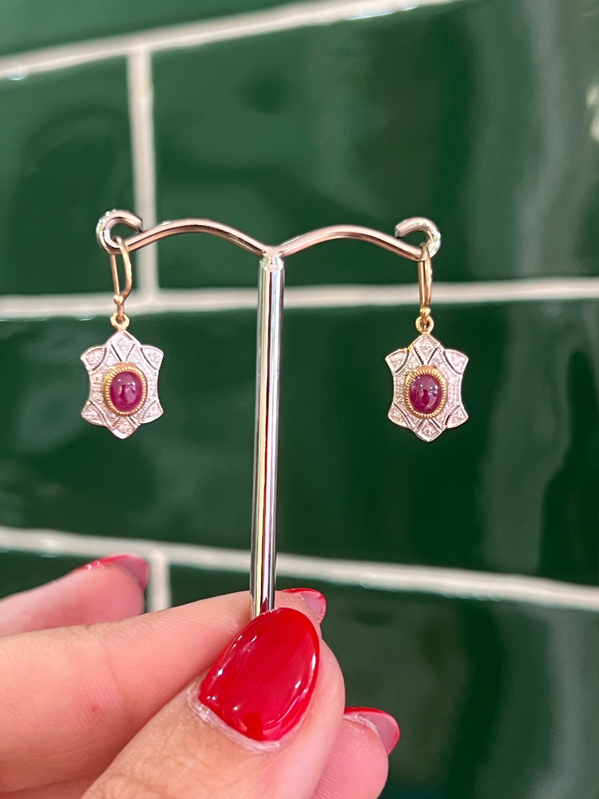 Gorgeous Cabochon Ruby & Diamond Earrings. Featuring a timeless old world design in a combination of 9ct yellow & white gold.