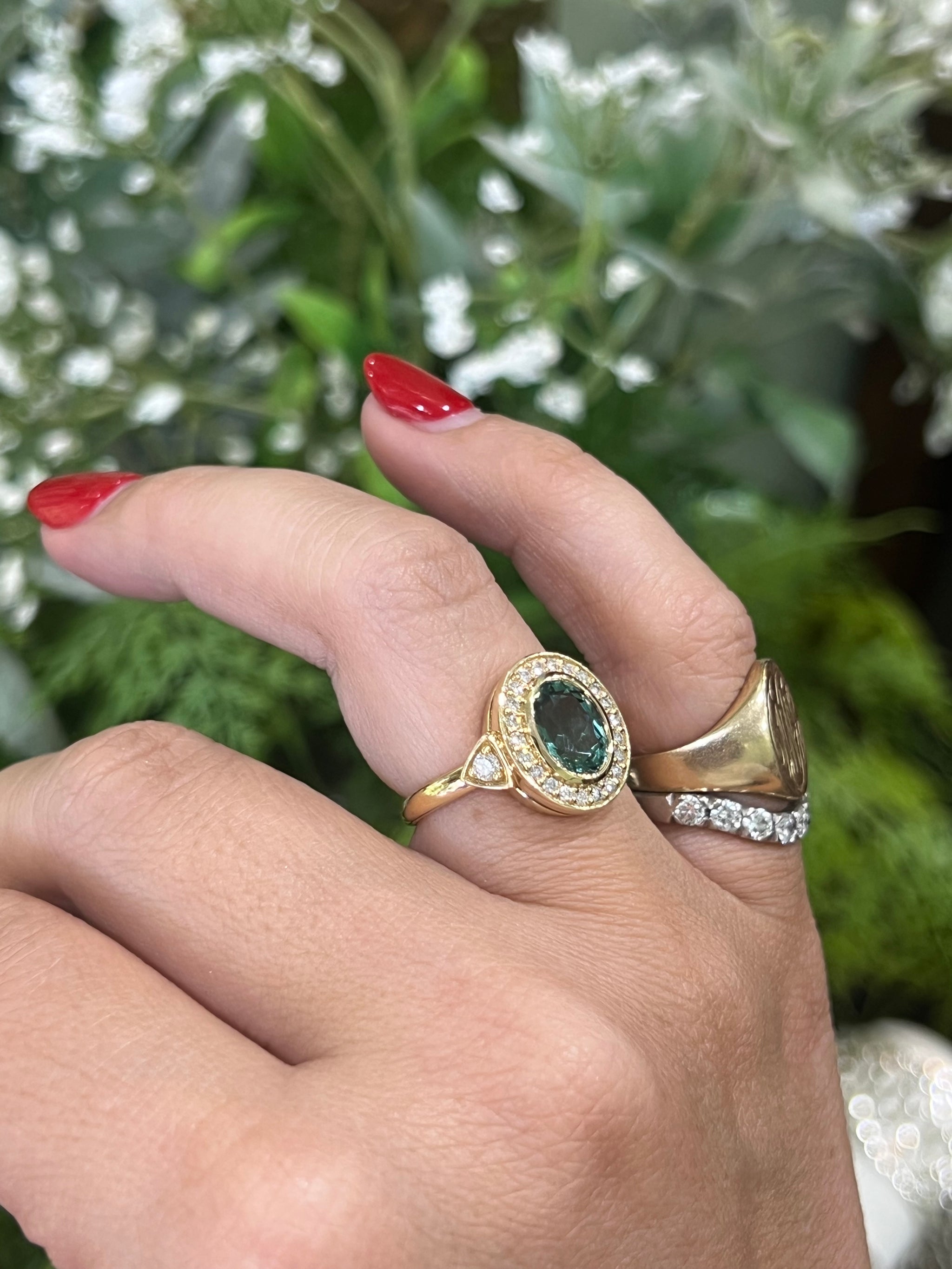 A vivid 2.00ct Zambian Tourmaline encased in solid 18ct yellow gold and 0.40ct of diamonds.  This beautiful ring is simple yet impeccably stylish.