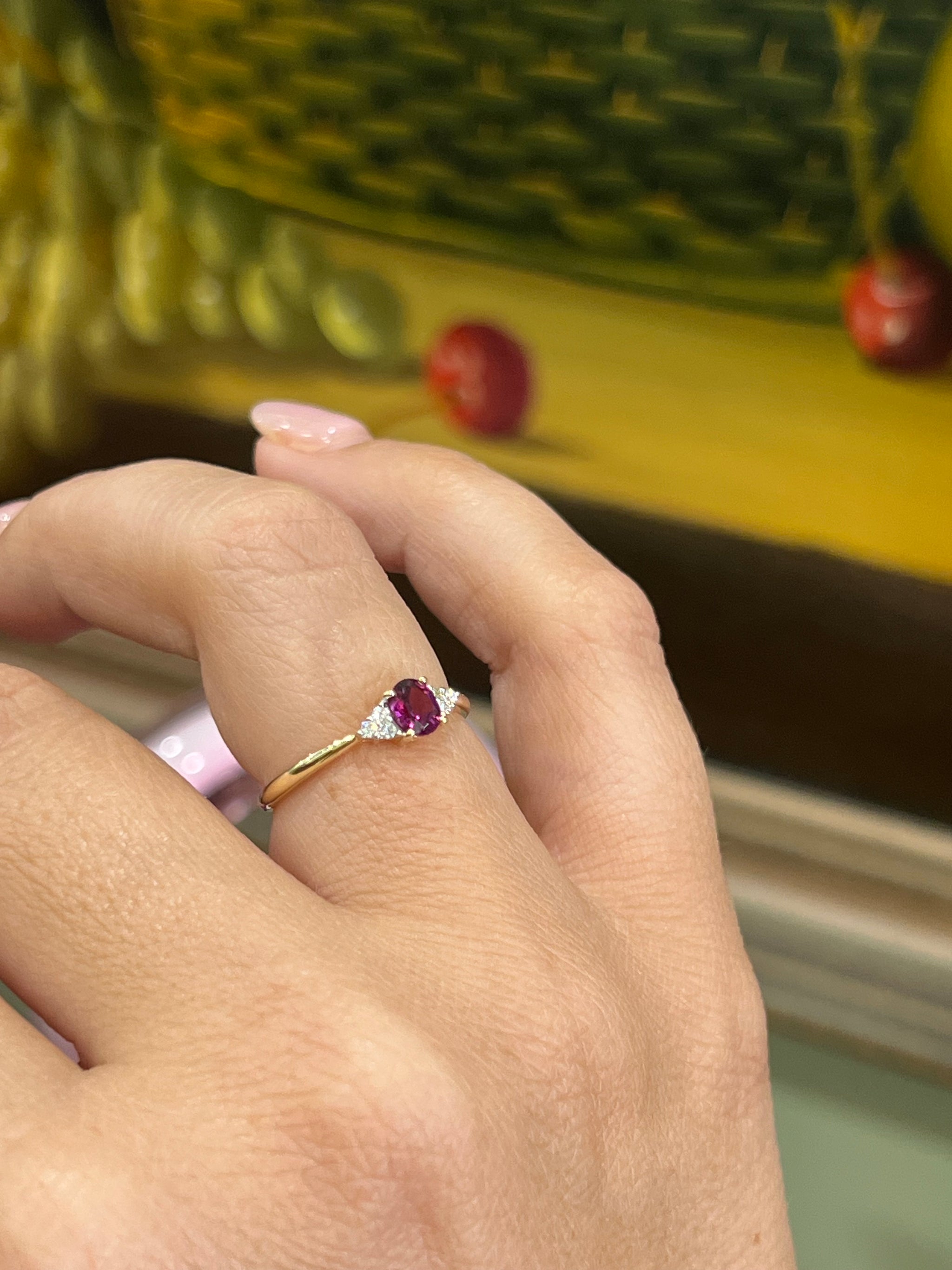 Featuring a round Rhodalite Garnet, with a claw set trio of diamonds either side.  The ring has a total carat weight of 0.12ct of diamonds.