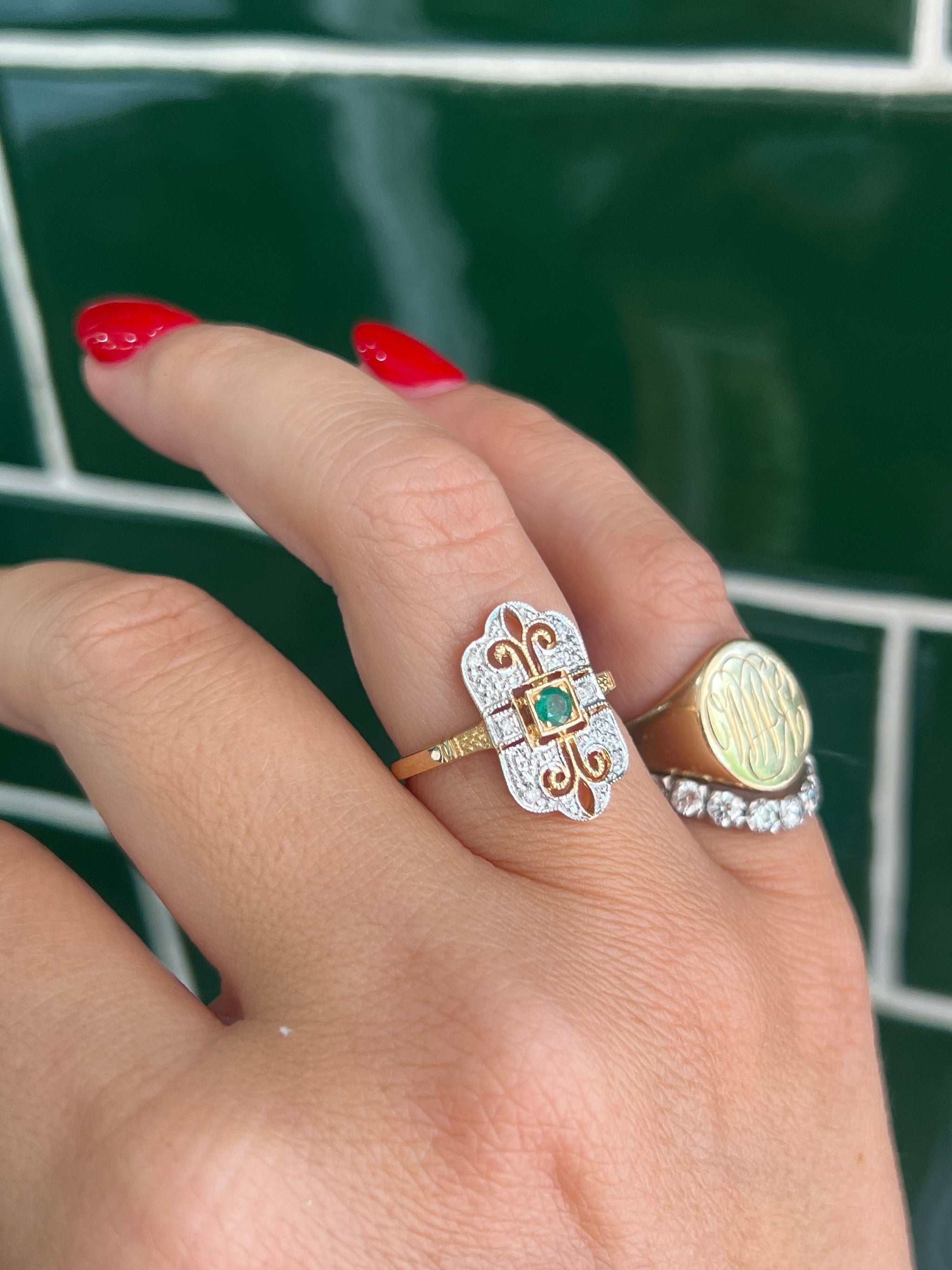 She’s a pure romance.  A bright natural round Colombian Emerald surrounded in a intricate old world design of grain set diamonds.  The ring has a total diamond weight 0.20ct.
