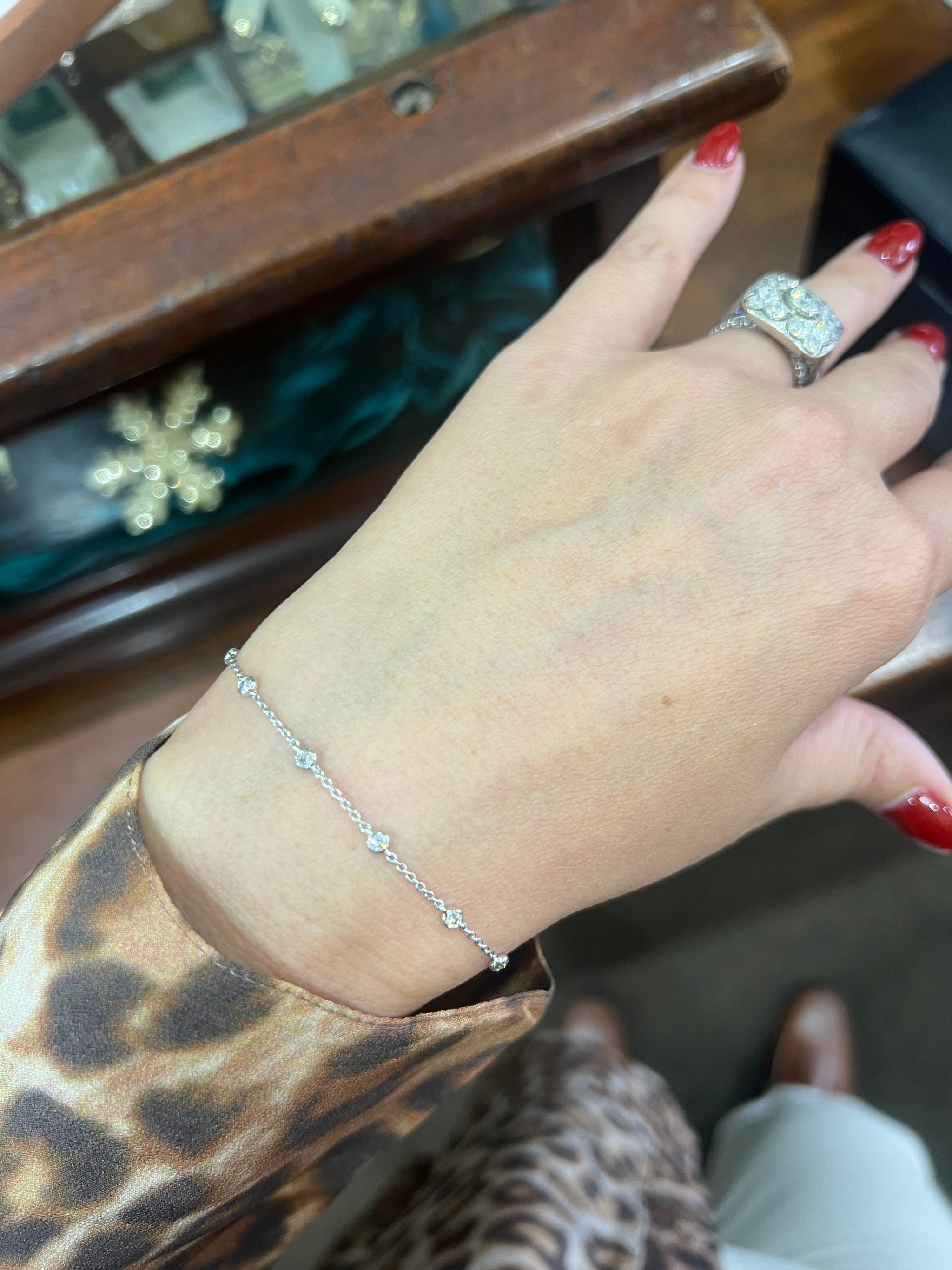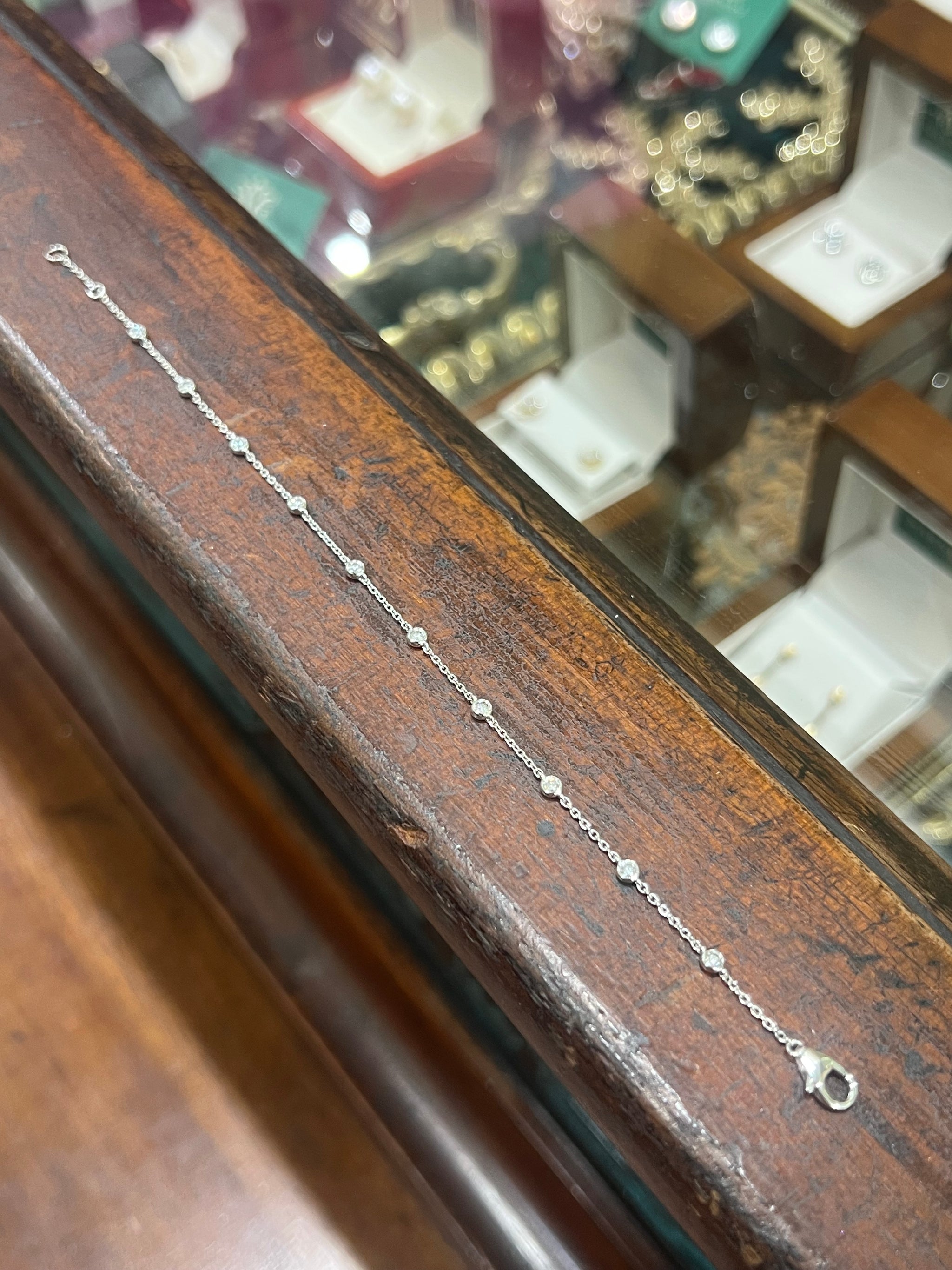 A beautiful petite classic piece of jewellery, for the lady that loves sophisticated style. 10 Round brilliant cut diamonds bezel set and evenly placed along the bracelet.  Manufactured in 18ct white gold.