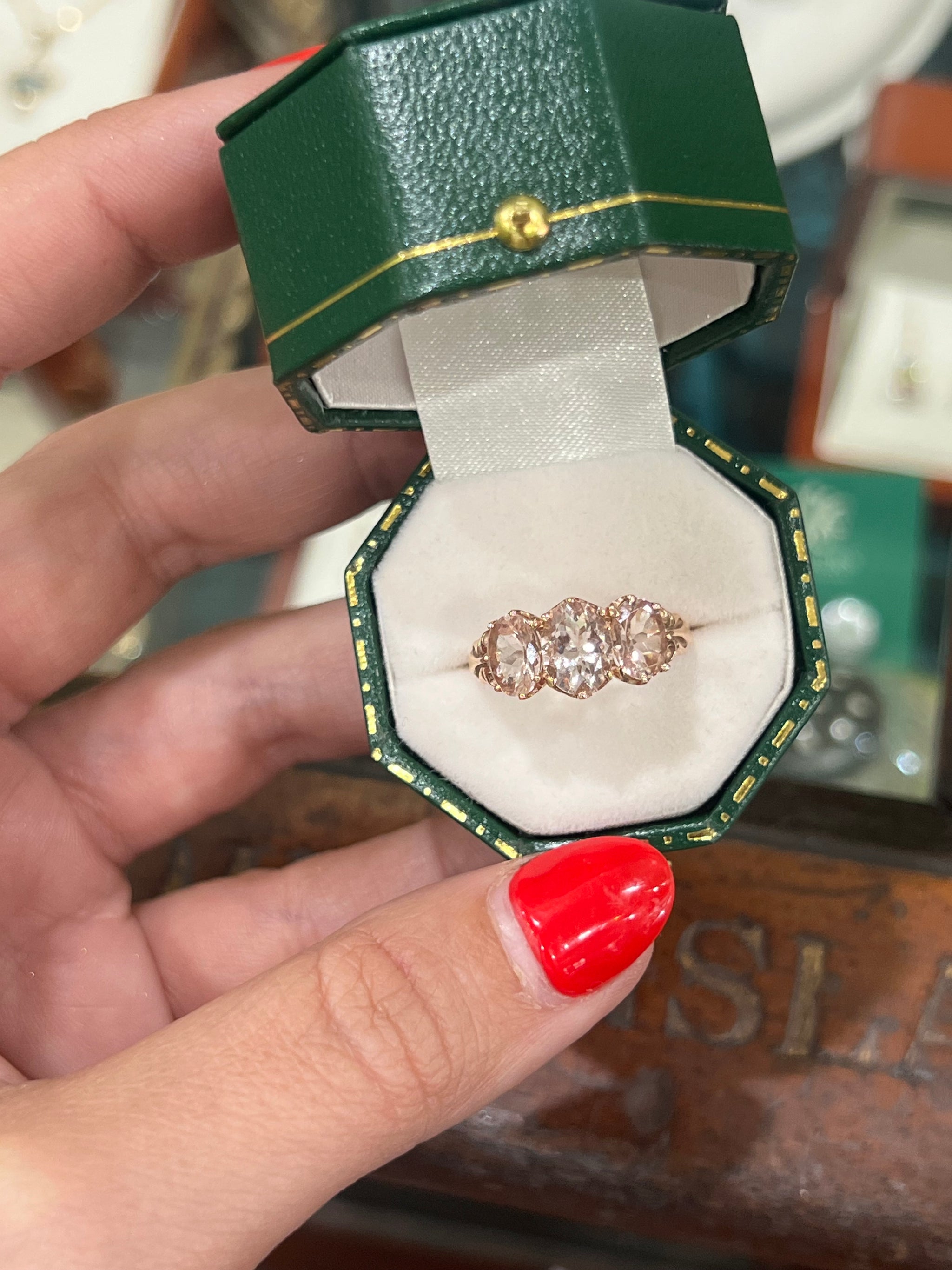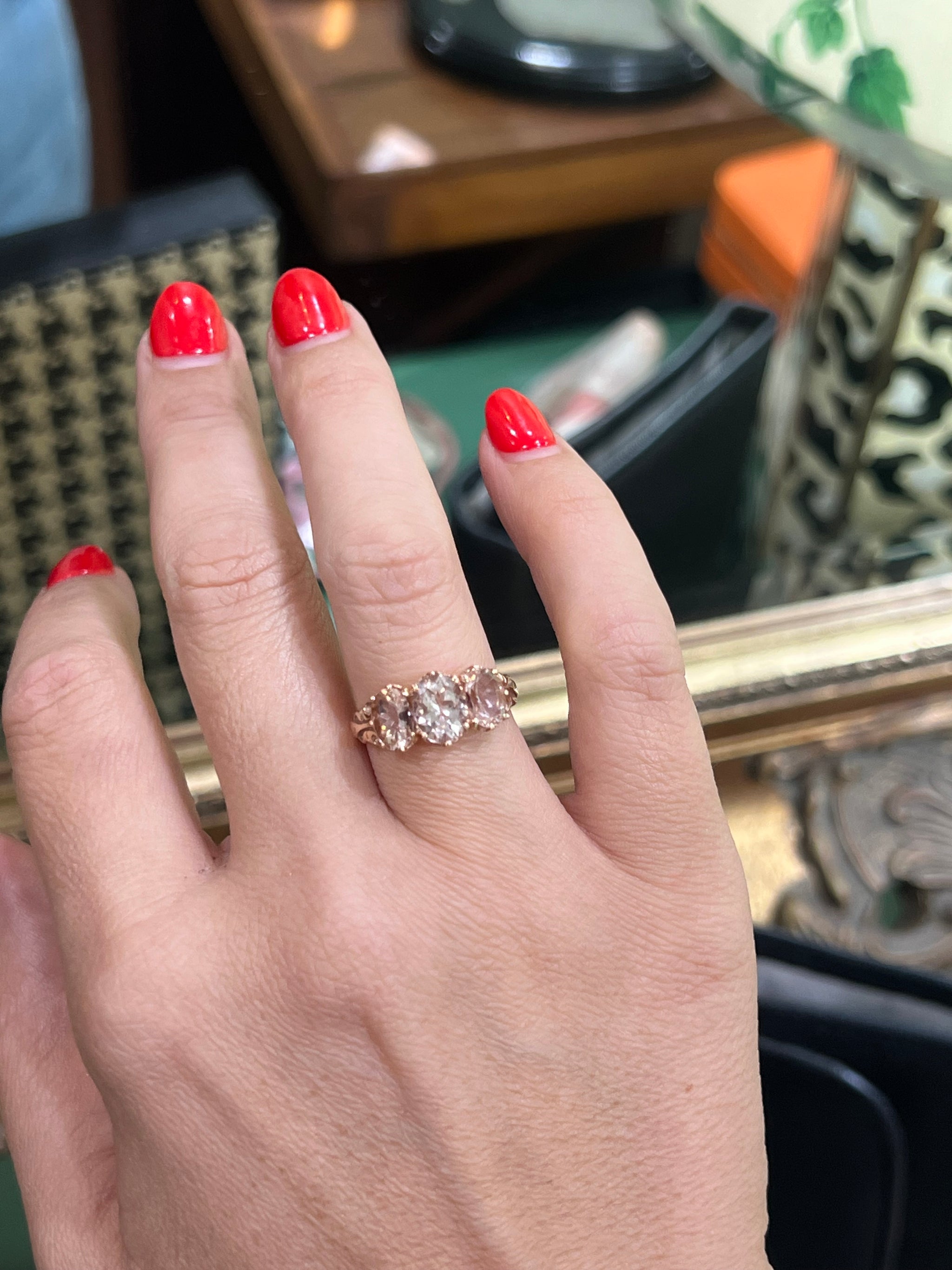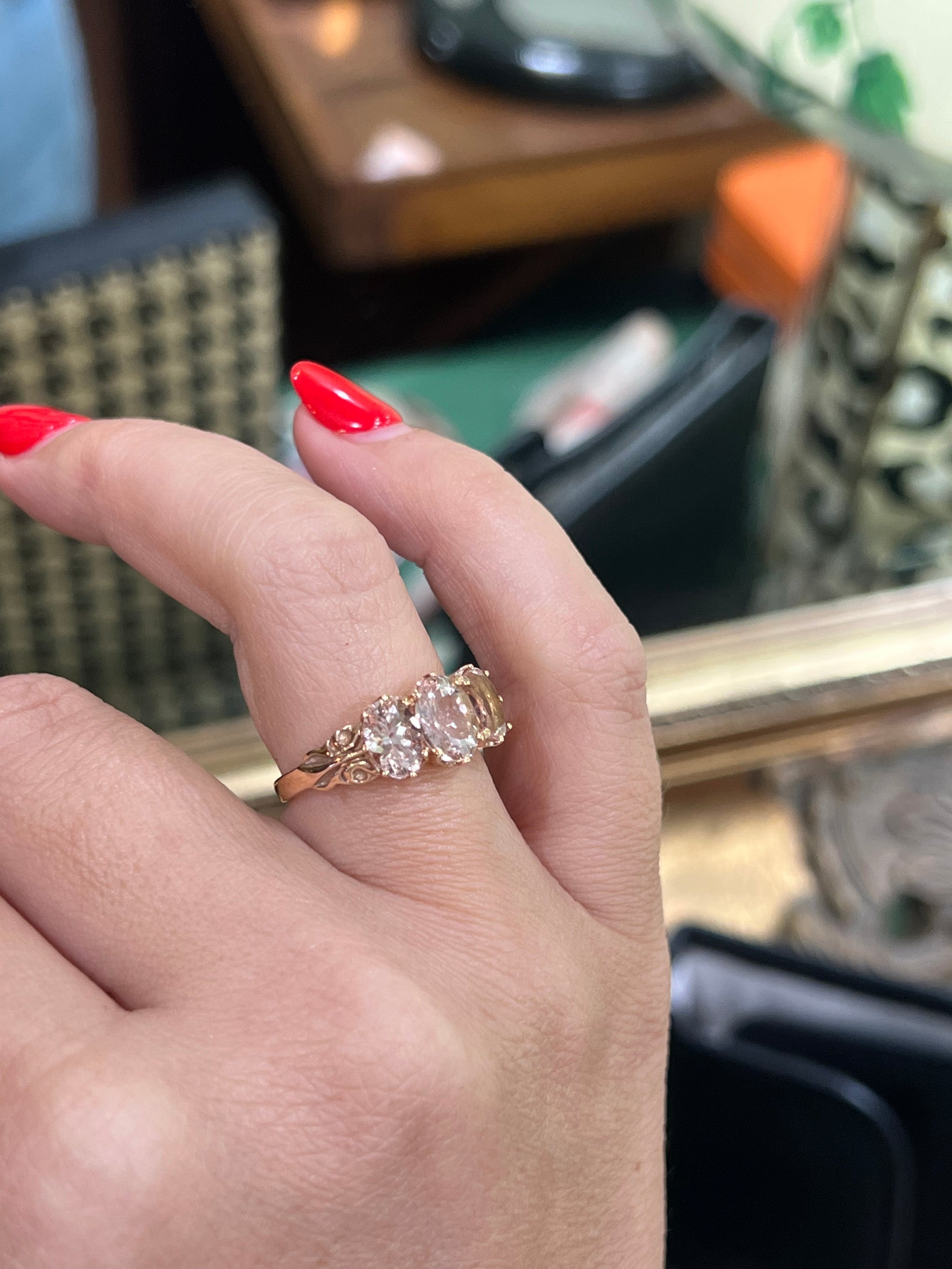 A superb three stone ring set with natural Morganites from Madagascar.  The ballet pink morganites have a total carat weight of 3.80ct, claw set in 9ct rose gold with a lovely romantic motif on the shank.