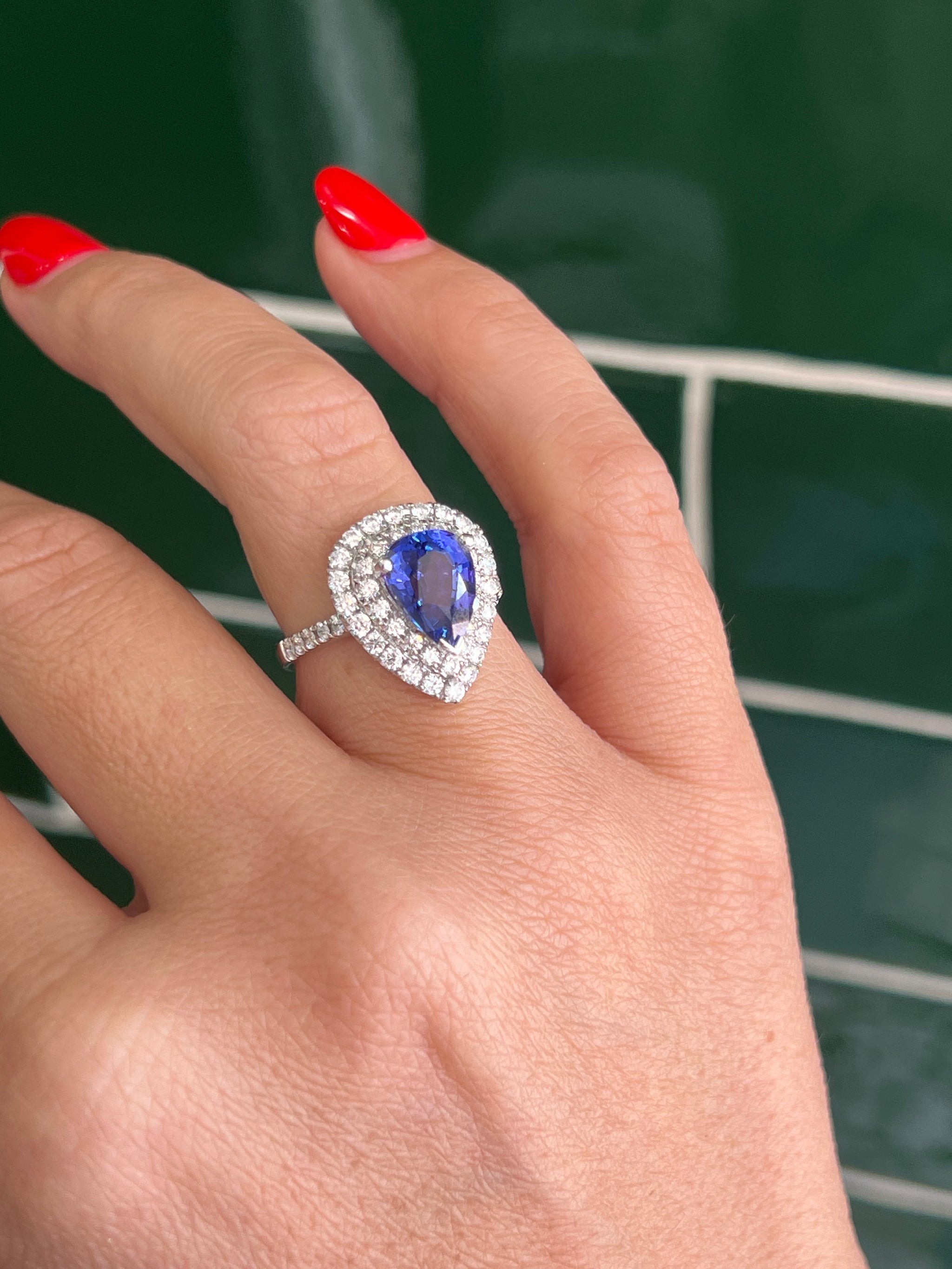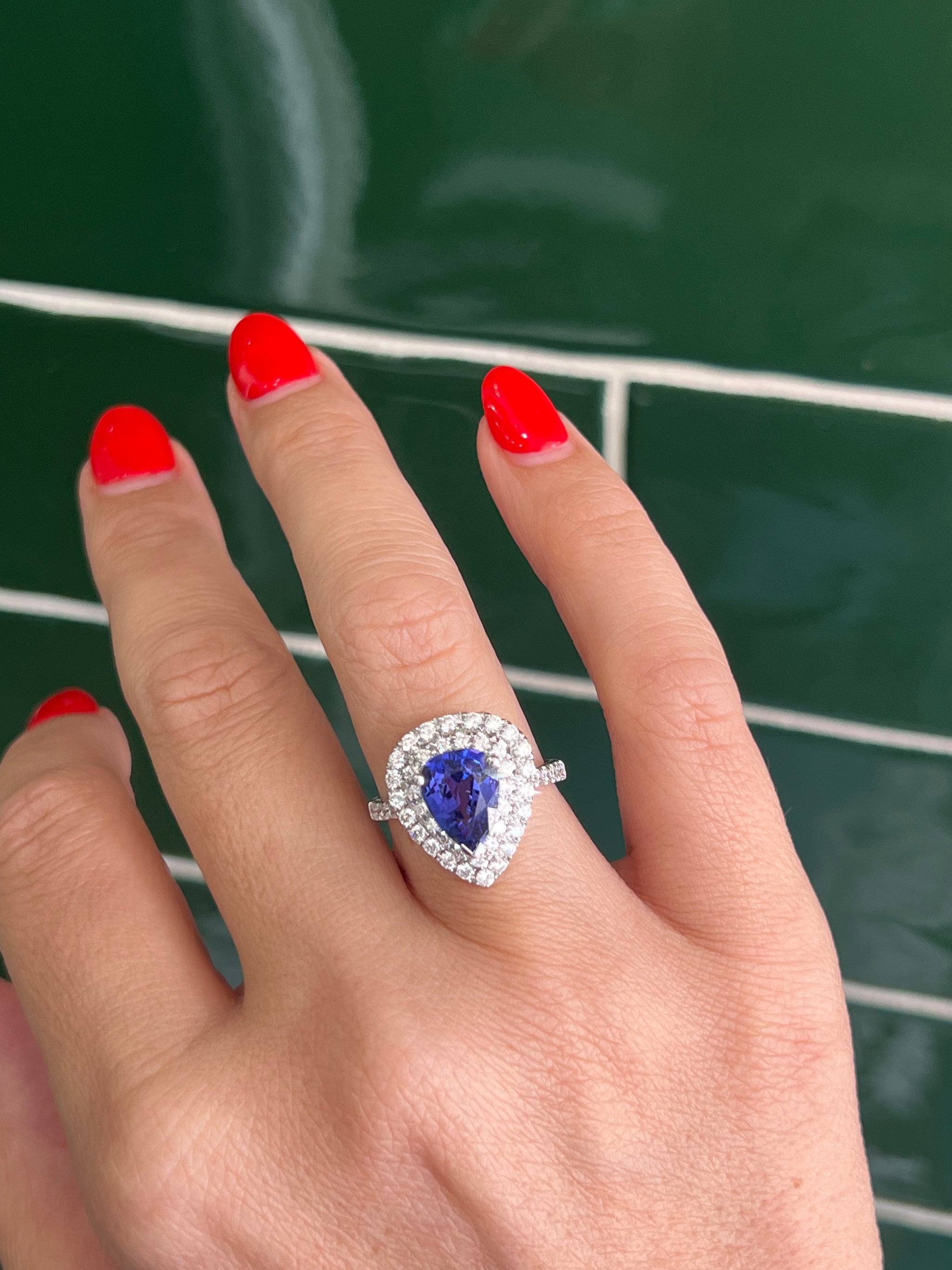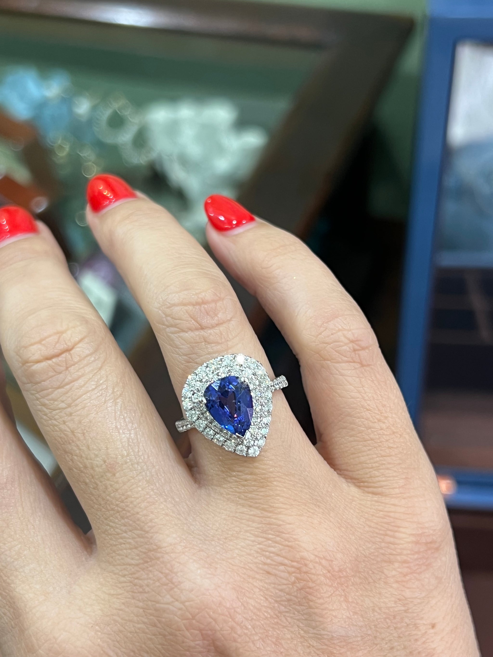 A captivating statement of colour and craftsmanship, this exquisite ring is centred around a vivid 2.83ct Tanzanite, cut to a graceful pear shape that elongates the finger with effortless elegance. The gemstone displays a mesmerising play of rich blue and violet tones—an unmistakable hallmark of fine Tanzanite—shifting beautifully with the light and offering depth, vibrancy, and undeniable allure.