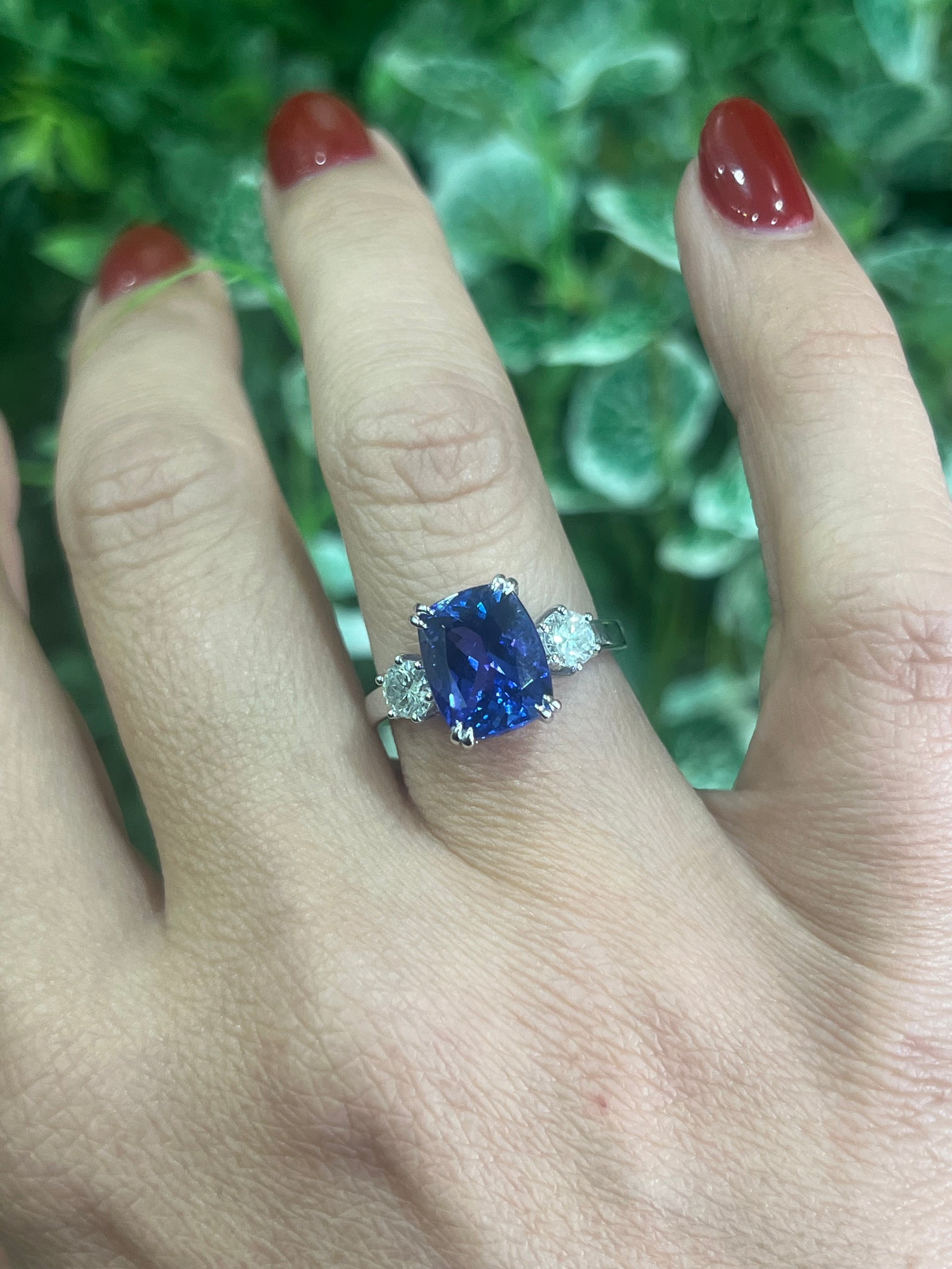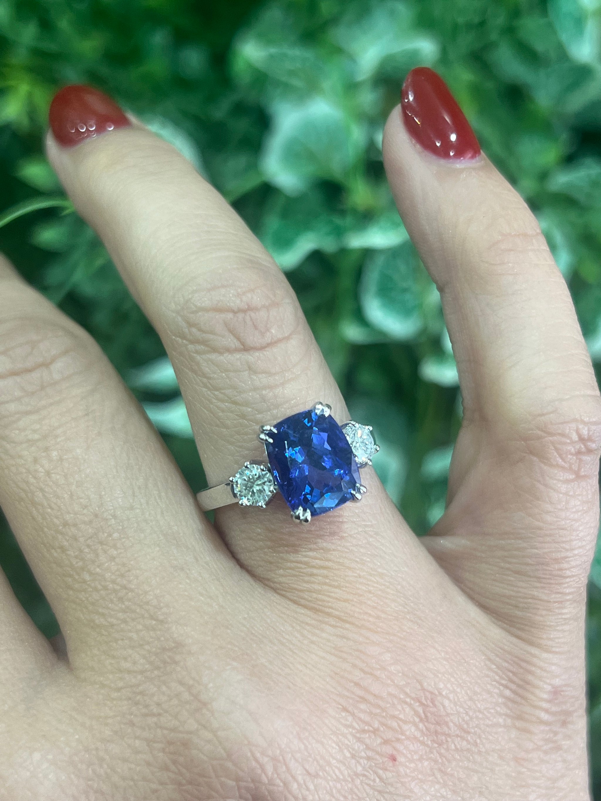 A true showstopper of a trilogy ring.  A vibrant blue Tanzanite is the central star of this ring.  The Tanzanite is cut into a perfectly faceted elongated cushion, weighing 4.78 carats.  The Tanzanite is flanked either side by a 0.30ct round brilliant cut diamond, graded E VS.