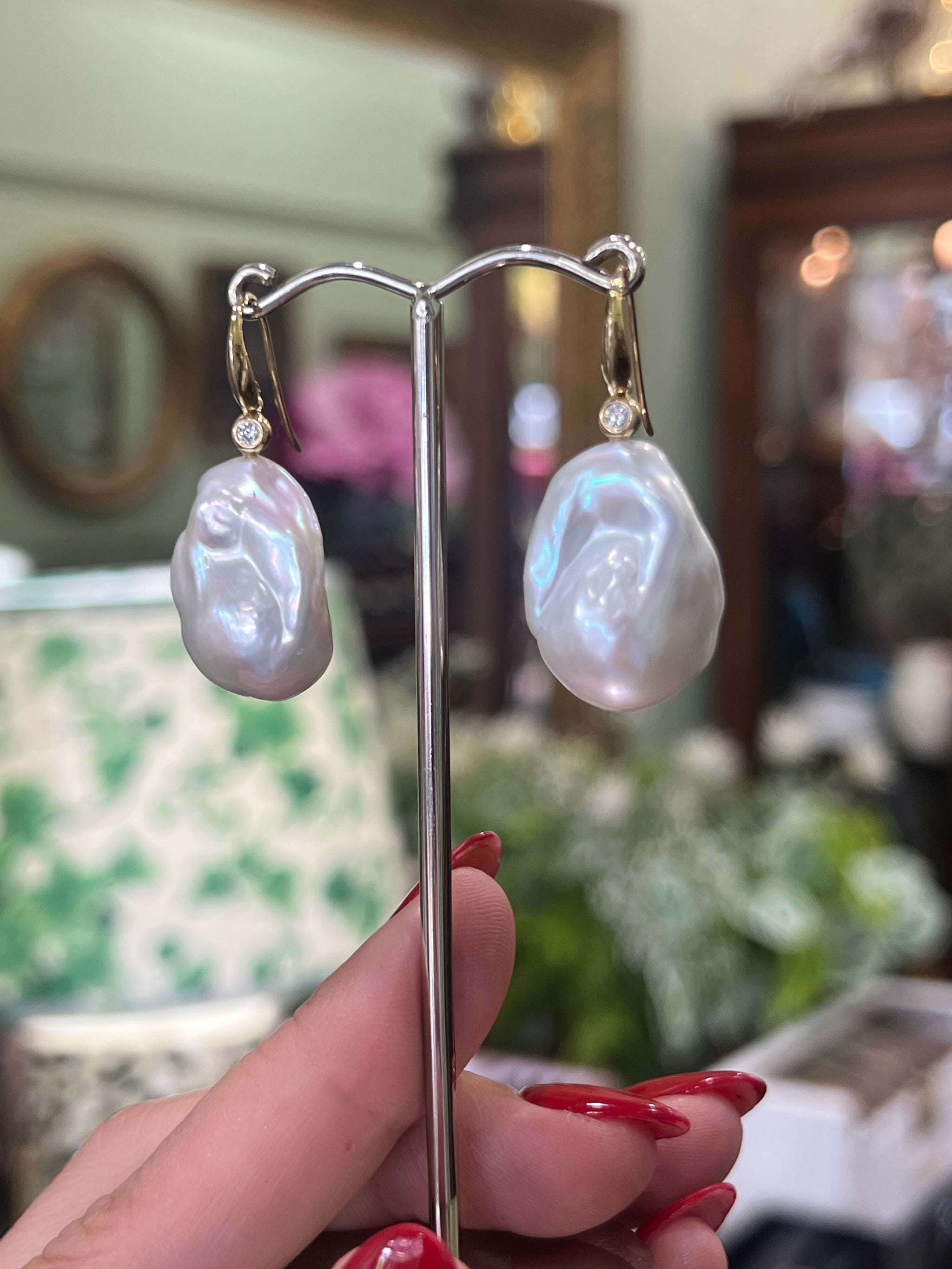 A lustrous pair of divine Baroque Pearl and Diamond earrings, set on solid 9ct yellow gold swan hooks.  Elegant and sophisticated earrings for the ladies that love a big pearl earring.