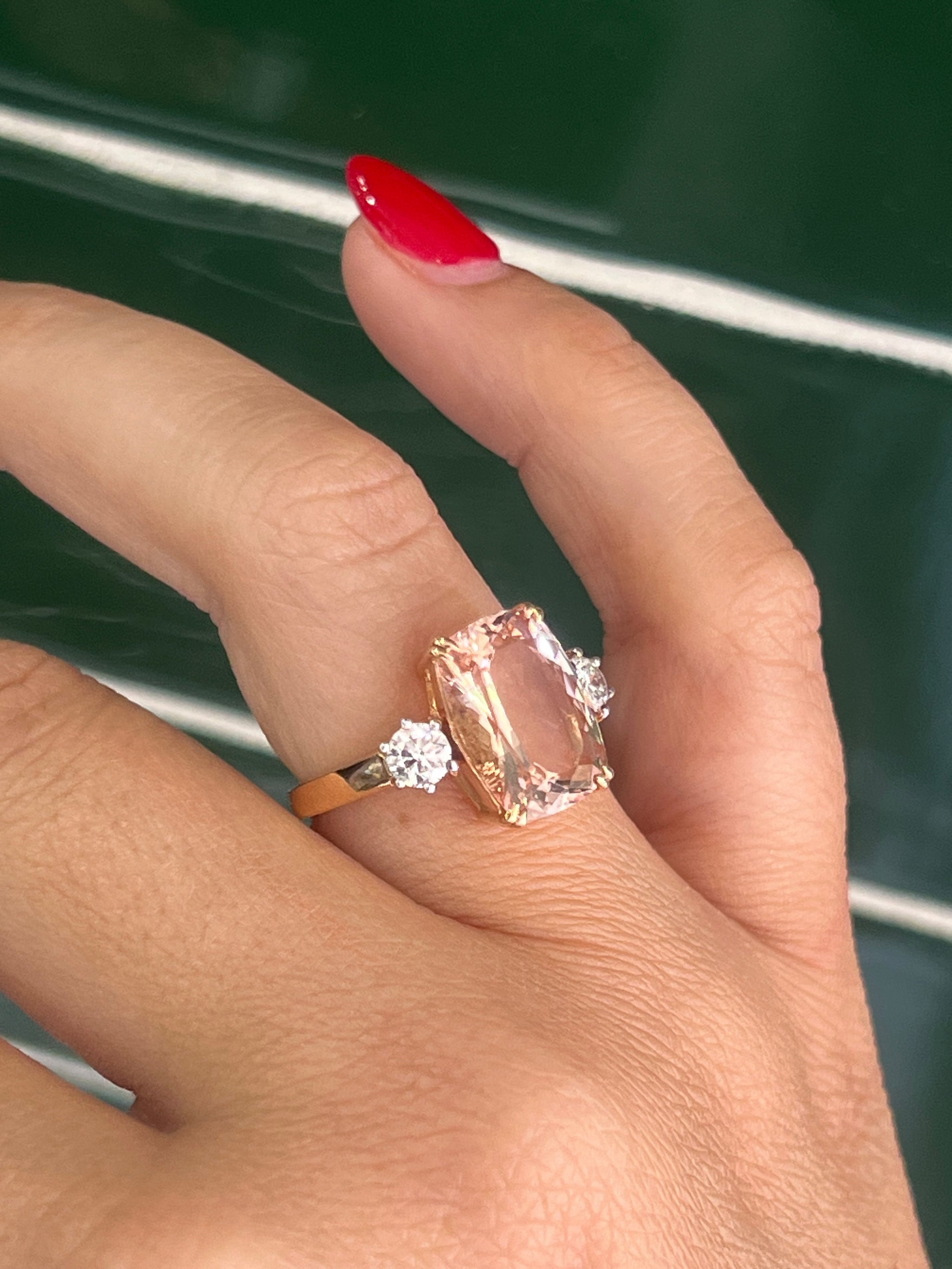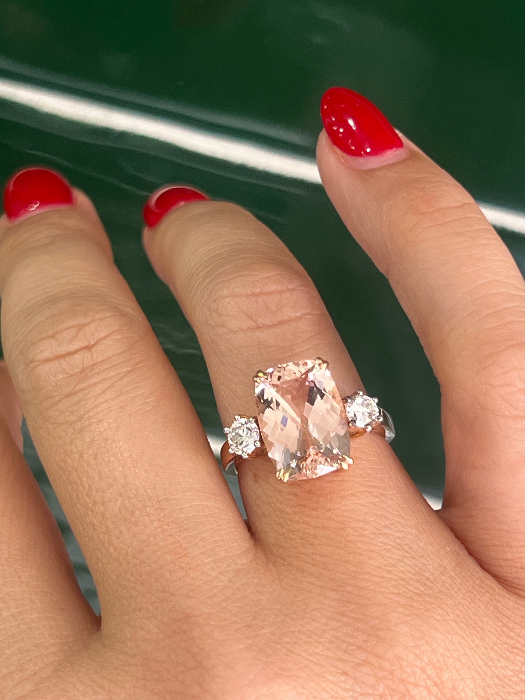 Set with a ballet Pink Morganite weighing 5.30ct in an elongated cushion.  Claw set, and flanked either side by a 0.30ct round brilliant cut diamond.  Diamonds are set in 18ct white gold, with the remaining ring constructed in 18ct rose gold.