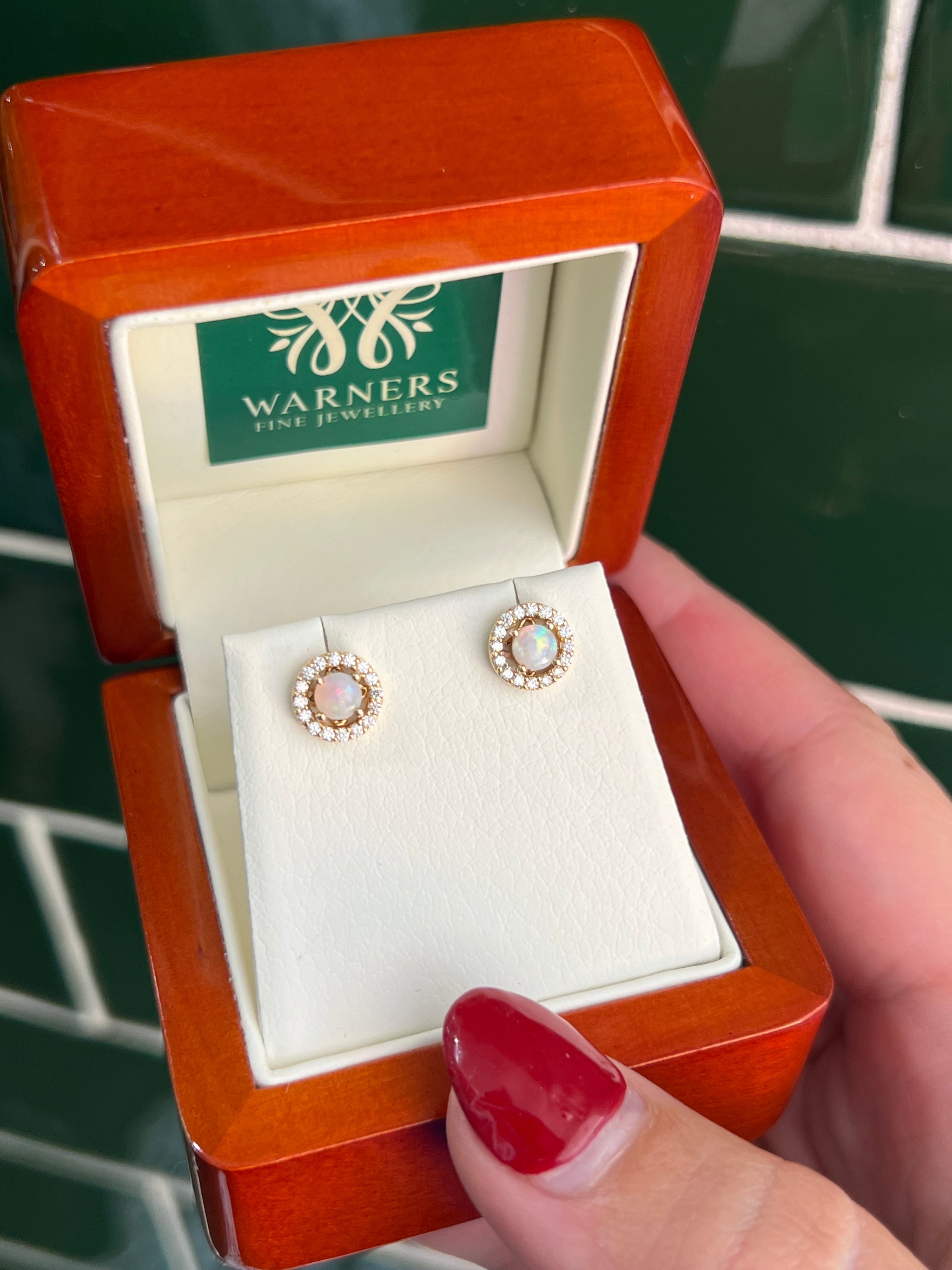 A beautiful pair of solid Australian Opal stud earrings, set with halos of 0.25ct of diamonds.  Manufactured to perfection in 18ct yellow gold.