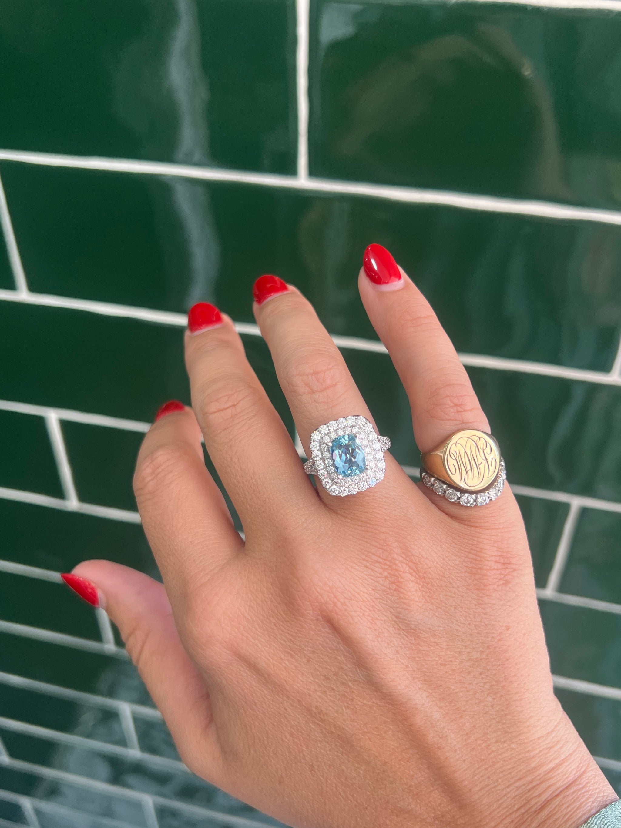 A lovely pale Aquamarine & Diamond three stone ring. Featuring a 3.33 carat princess cut...